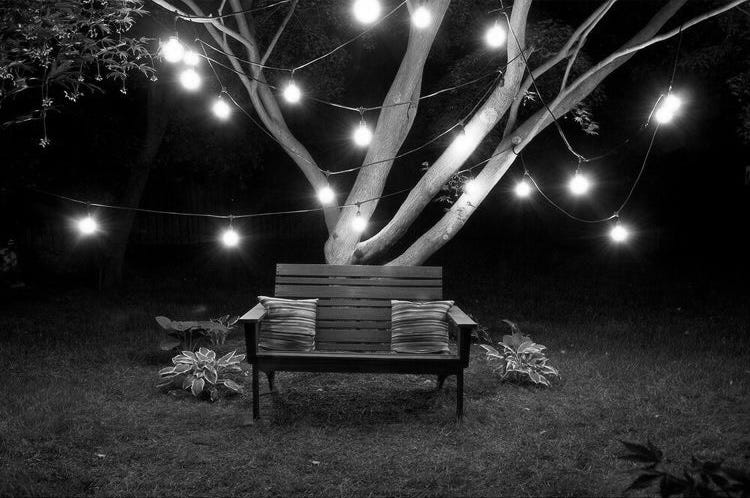 Cuando llegamos estaba oscuro. Encendí las luces de mi balcón del que en la distancia se veía el mar y encedí unas bombillas que cuelgan del árbol que tengo en el patio y debajo de él, hay un pequeño banco que me regaló mi mamá en una visita reciente.